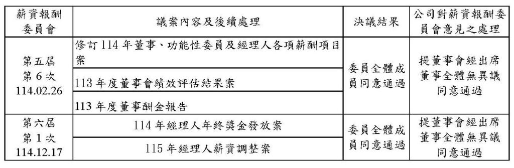為健全本公司董事及經理人薪資報酬制度,爰依「股票上市或於證券商營業處所買賣公司薪資報酬委員會設置及行使職權辦法」第三條之規定,訂定本薪資報酬委員會組織規程,以資遵循。薪酬委員會旨在協助董事會執行與評估公司整體薪酬與福利政策,以及董事及經理人之報酬。 薪酬委員會至少每年召開二次常會,有關本委員會會議召開情形及每位委員的出席率,請參考本公司各年度年報。