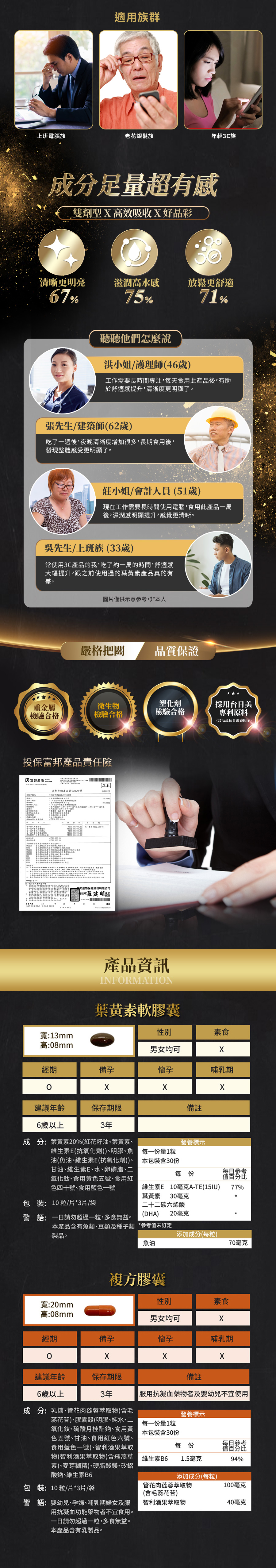 葉黃素20%(紅花籽油、葉黃素、維生素E(抗氧化劑))、明膠、魚油DHA(魚油、維生素E(抗氧化劑))、甘油、維生素E、水、卵磷脂、二氧化鈦、食用黃色五號、食用紅色四十號、食用藍色一號
